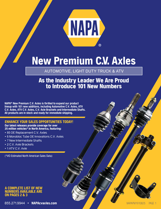 NAPA® New Premium C.V. Axles is pleased to announce the release of 45 New Automotive C.V. Axles and 8 ATV C.V. Axles, including HD applications.
